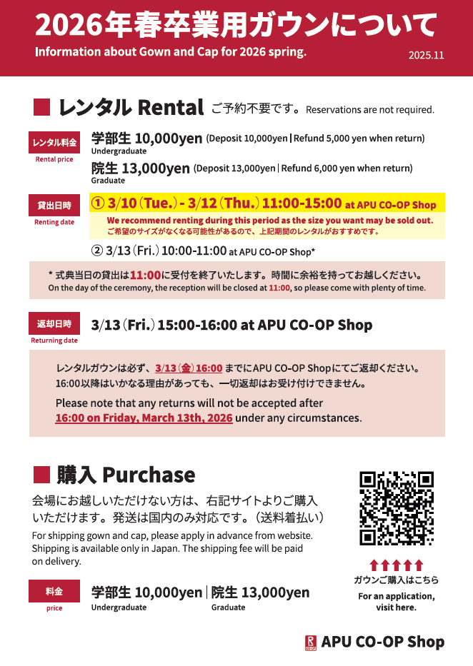 On graduation day, the APU-COOP SHOP will be selling a limited number of bouquets. Express your appreciation to seniors, teachers, and friends with a beautiful bouquet!