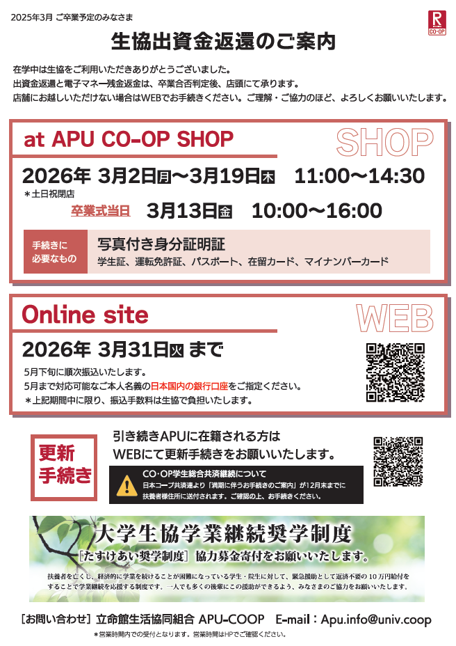 - 正確な残高把握とお手続きのため、卒業式会場での出資金返還・電子マネー(学生証・生協アプリ)の返金はできません。予めご了承ください。