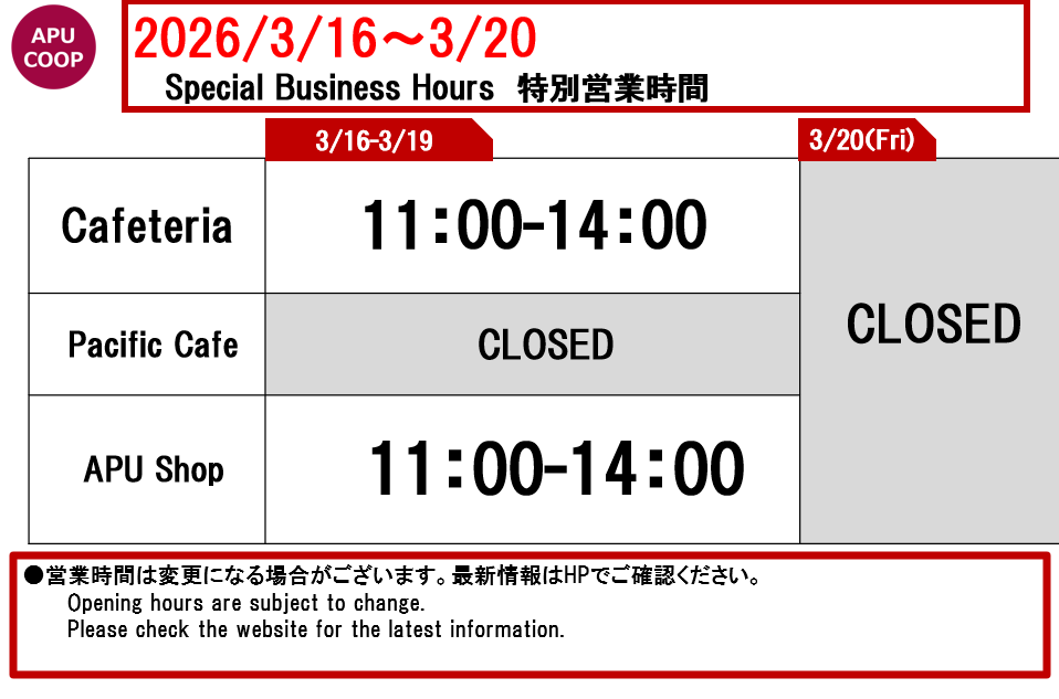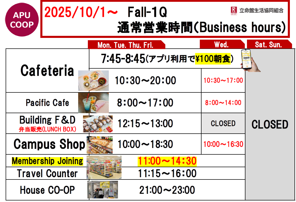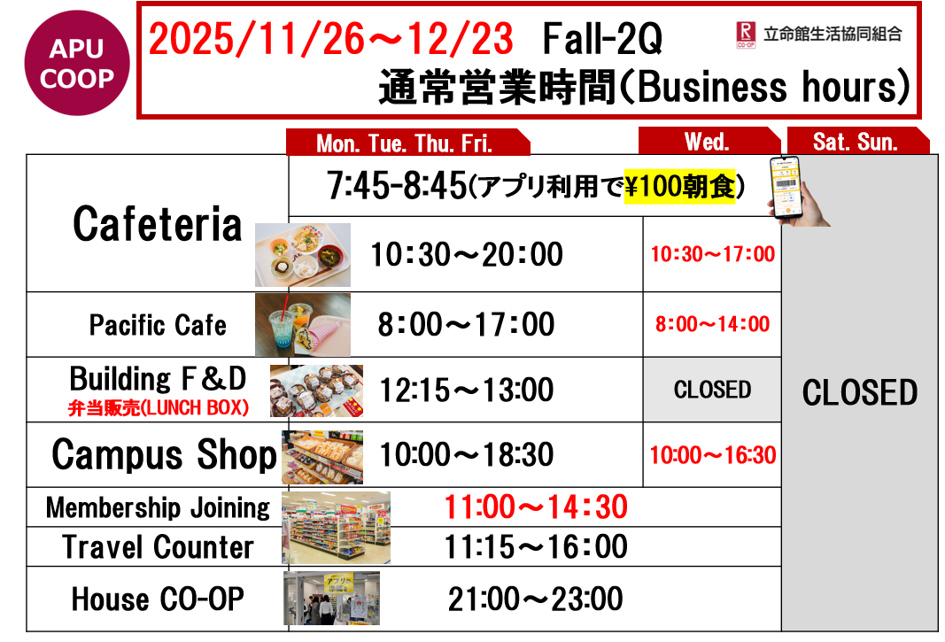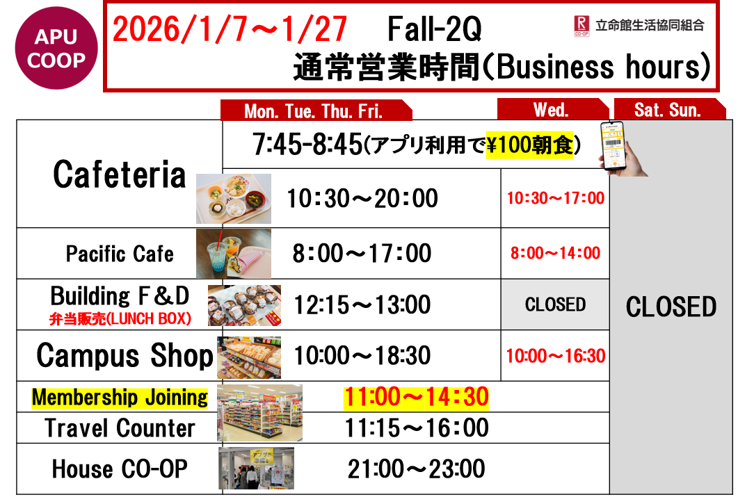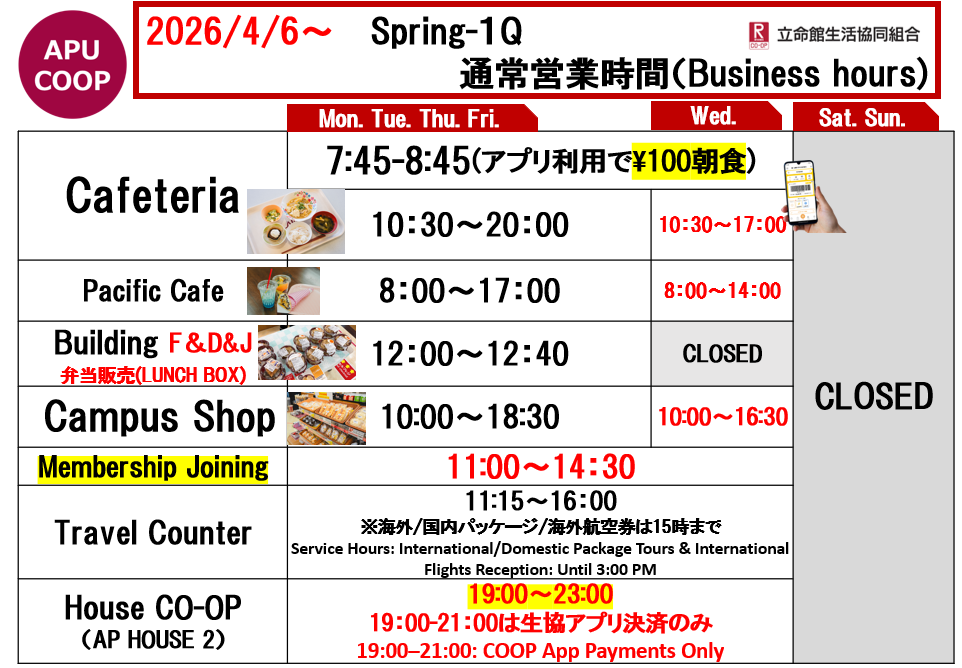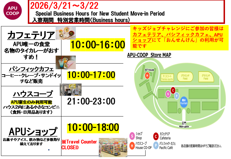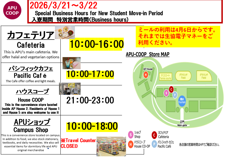 ショップのテイクアウト商品のご利用による食堂混雑緩和にもご協力をお願いいたします