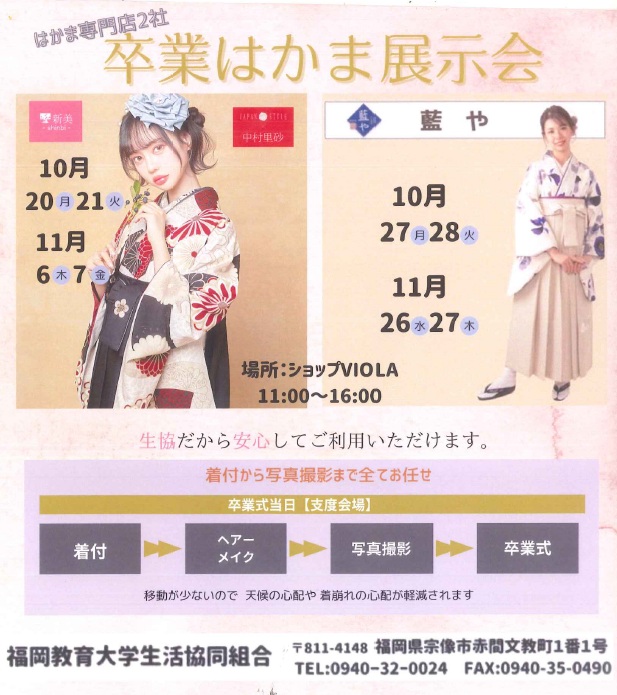 2025年10月07日(火) |お知らせ 卒業袴展示会のご案内 新美 10月20日、21日、11月6日、7日 予約不要 藍や 10月27日、28日、11月26日、27日 要予約 場所:ショップVIOLA