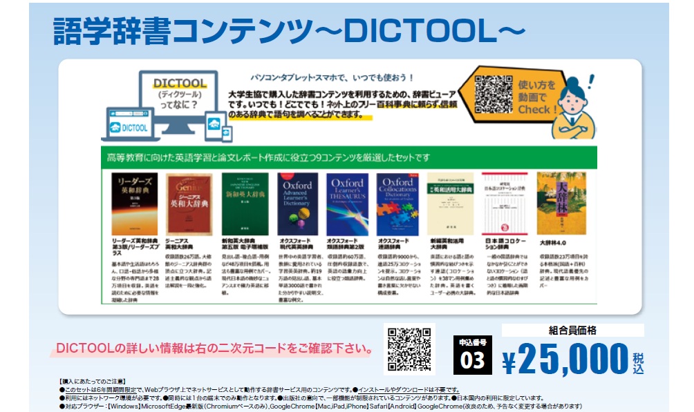 ※『【03】DICTOOL』をご利用には、①大学生協電子書籍サイトへの会員登録、②専用ビューアへのサインインが必要です。以下の利用規約・約款をご一読いただき、同意の上お申込みください。