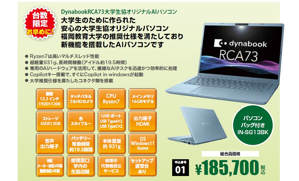 ここに掲載する福教大生協パソコンは、大学生協オリジナルモデル(市販されていないモデル)のため増産できません。したがって、申込み多数の場合、期日前の申込みでもお断りすることがあります。お早めに申込みください。