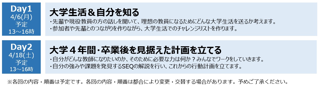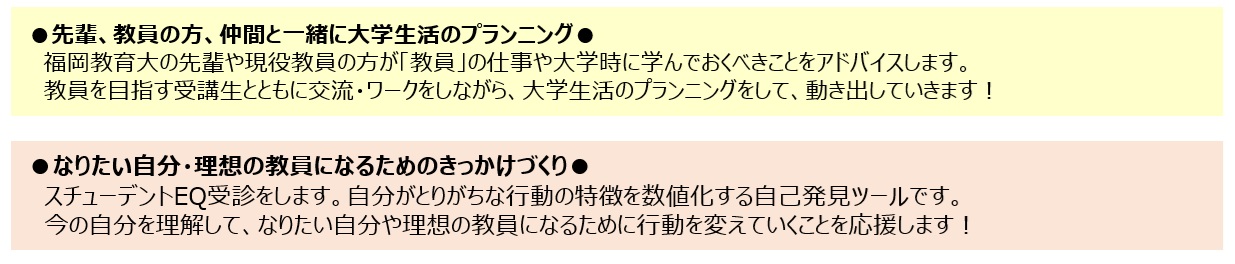 この講座は、単なる知識の習得ではなく、「自分がどんな教師になりたいか」を深く考え、SEQやワークを通して仲間とともに考える講座です。教師になった時にコミュニケーション能力が重要になってきます。入学スタートが一番重要な時期です。なんとなく大学生活を送るのではなく、明確な目標やこれから習得すべき知識や経験をプランニングする内容です。新入生のために大学の先輩もサポート致します。