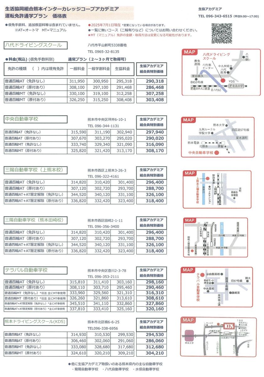 ※マニュアル(MT)コース,オートマ(AT)+マニュアル(MT)コースは制度の移行期でこの価格表と異なる場合があります。事前にお問い合わせをお願いいたします。