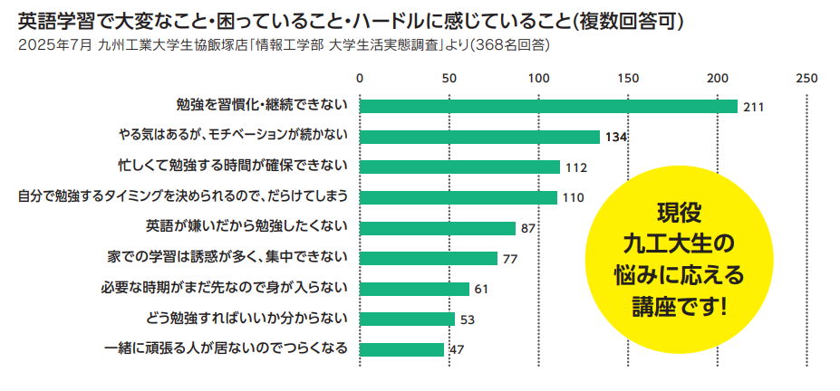 大学生活は、学年が上がるにつれて本当に忙しくなってきます。充実した大学生活を送るために、また納得のいく進路決定のためにも、TOEICスタート講座を通して英語力を磨いていきましょう!
