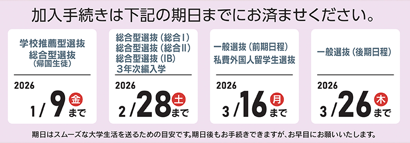 ※「新入生サポートセンター」・「入学準備説明会(実家通学予定の方・生協以外でお部屋を決められた一人暮らし予定の方)」では手続き方法も詳しくご案内いたします。(会場での申込み手続きはできません。予めご了承ください。)