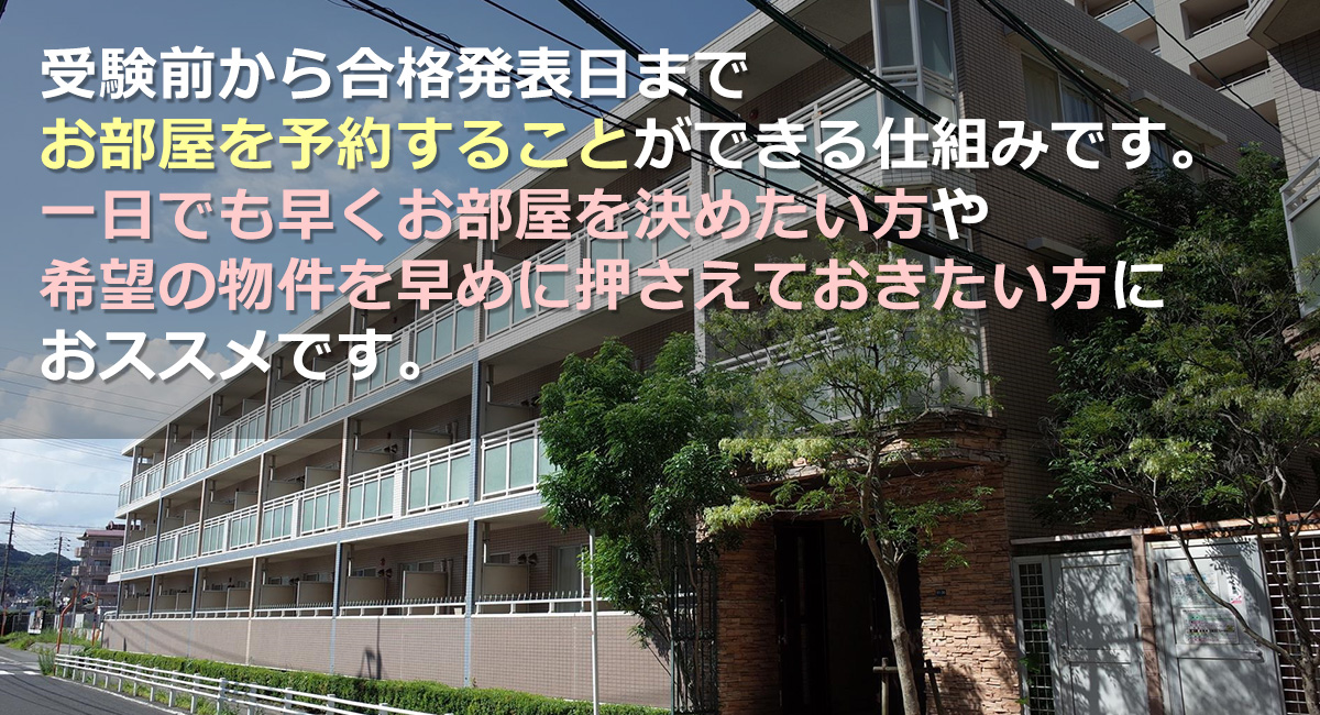 仮予約は合格後、入居していただくことが条件になります。必ず1度は仮予約された物件見学して下さい。 物件見学の際は新入生サポートセンターへの来場が必要です。