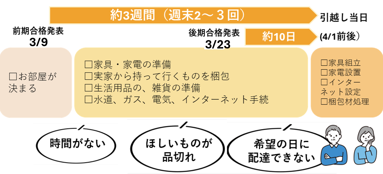 入学するにあたって、細やかなことまでは気が回らず、購入するものも多かったのですが学生さんがいろいろと教えてくれ参考になりました。また、家具家電等部屋探しと合わせて1日で済み、とても助かりました。ありがとうございました。みなさんの対応に感激しました。