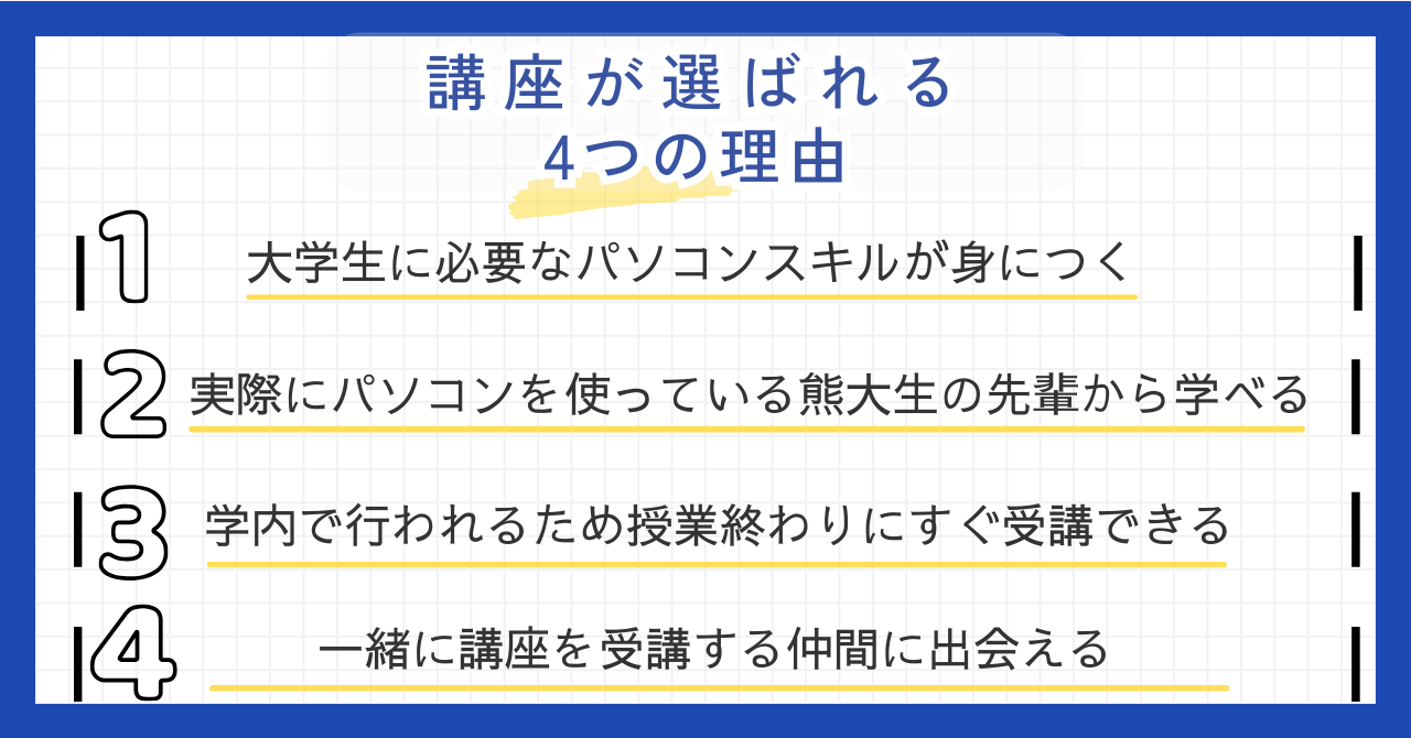 大学では高校の授業とは違って、パソコンの使い方や、レポートの書き方やメールの書き方など、一から丁寧に教えてもらえません。パソコン講座で得たスキルでレポート作成やプレゼン発表をスムーズに乗り越えよう!