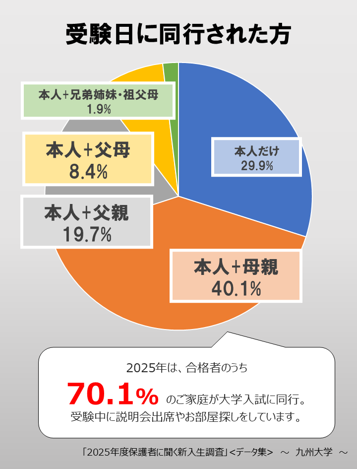 2025年新入生を対象とした「保護者に聞く新入生調査」では、70.1%の方が受験当日に付き添って来福されたという結果があります。
