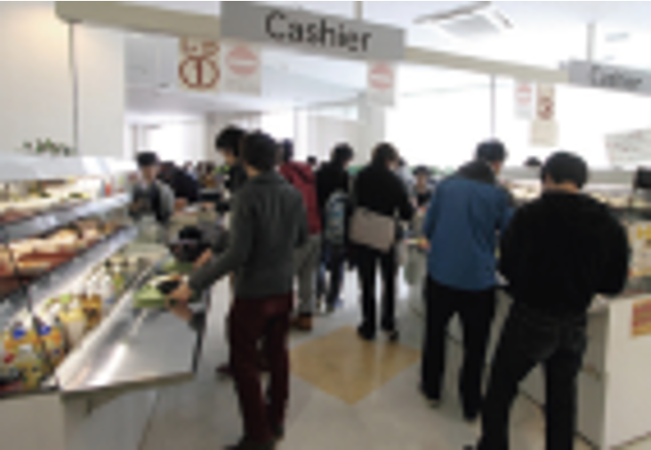 大学生協の食堂は、希望のメニューを受け取った後お支払となります。また、お昼休みの混雑解消のため、九州大学生協は生協電子マネー、ミールプリペの利用をお願いしています。皆さんもぜひご協力ください。