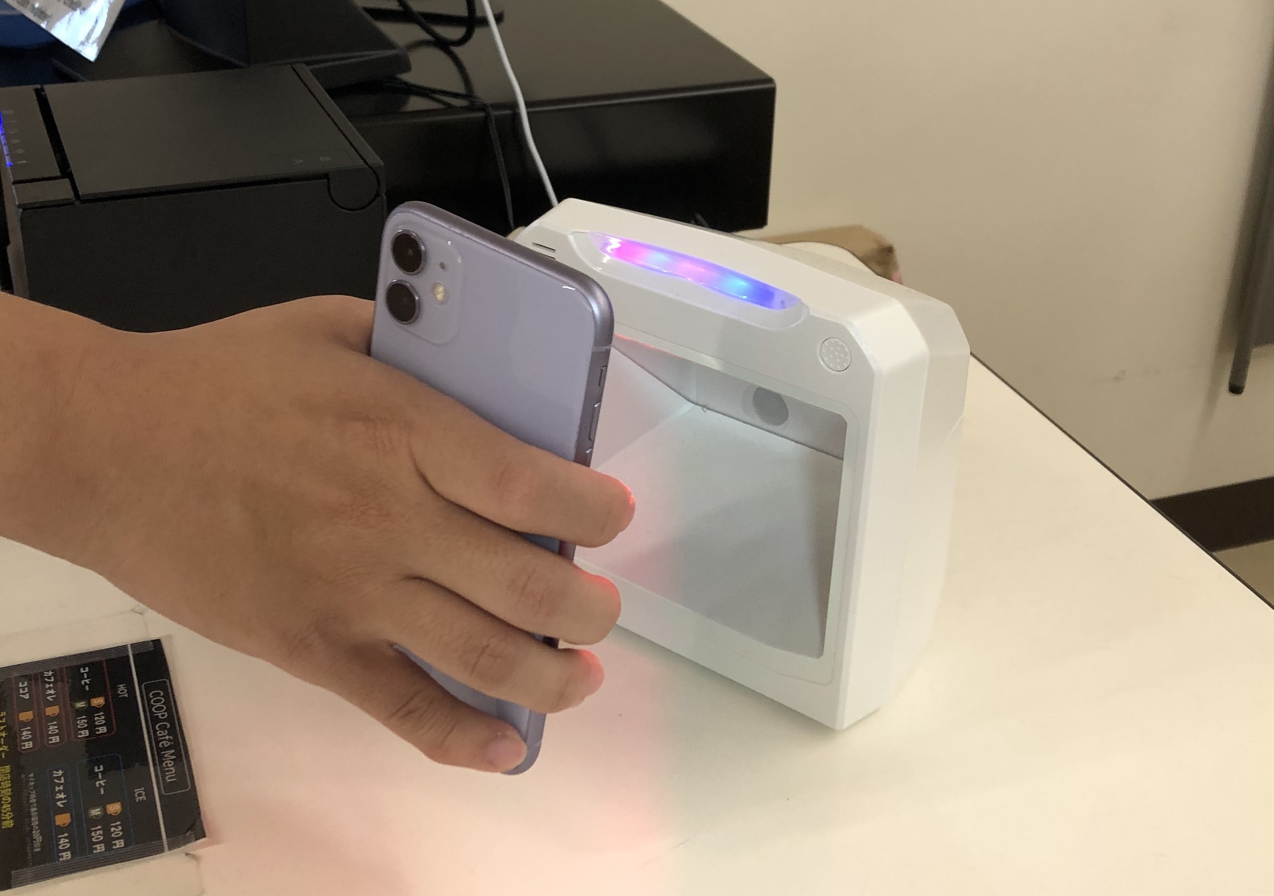 電子マネー(ミールプリペ、生協電子マネー)を利用するときは、スマホに登録している「大学生協アプリ」を開いて、スキャナーにかざしてください。