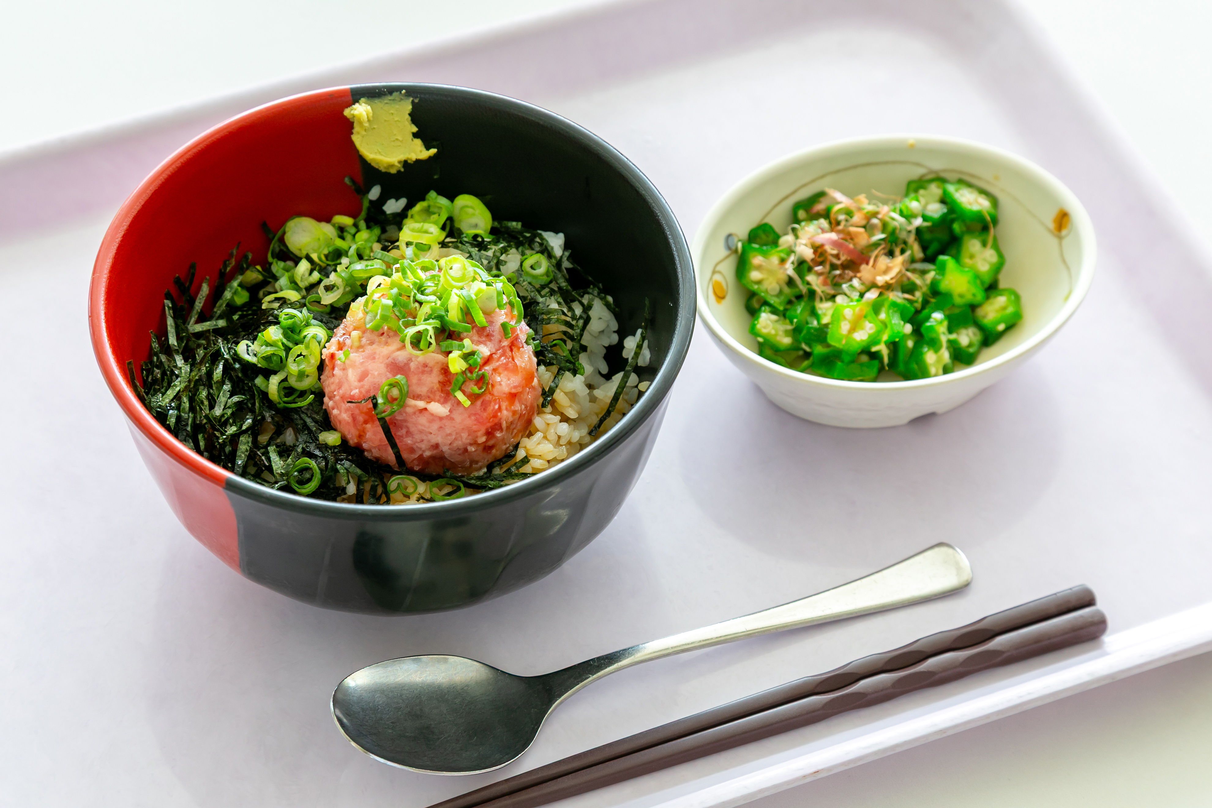 飲み物や小鉢・副菜はレジにならぶまでに取ります。トレイは縦向きにしてならびましょう。支払いの順番が来るまでにアプリやお財布は準備しておきます。