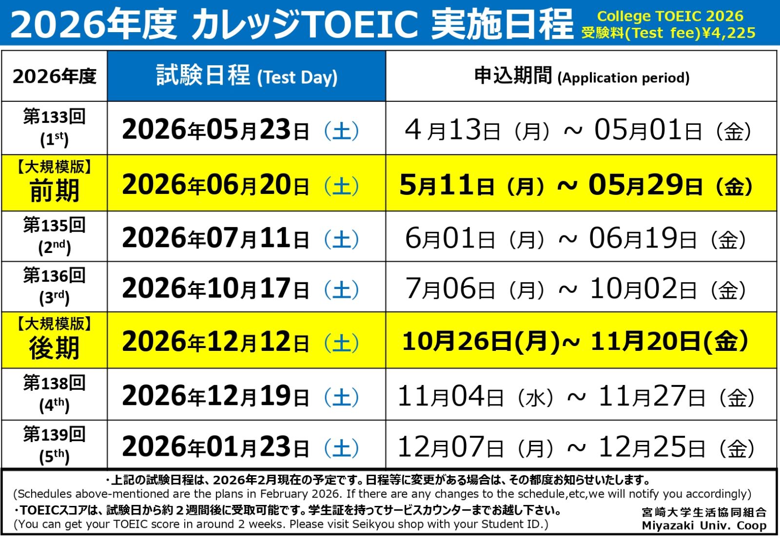 宮崎大学生協では、宮崎大学木花キャンパス内にて実施するカレッジTOEICの実施・運営を行っています。