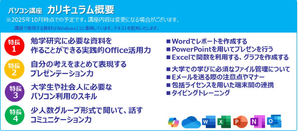 入学直後から始まるパソコンを使った履修登録、レポート、プレゼンなどは誰もが経験します。それらを経験してきた現役の大学生が厳選した講座の内容は、どれも大学生活で必要になるものばかりです。
