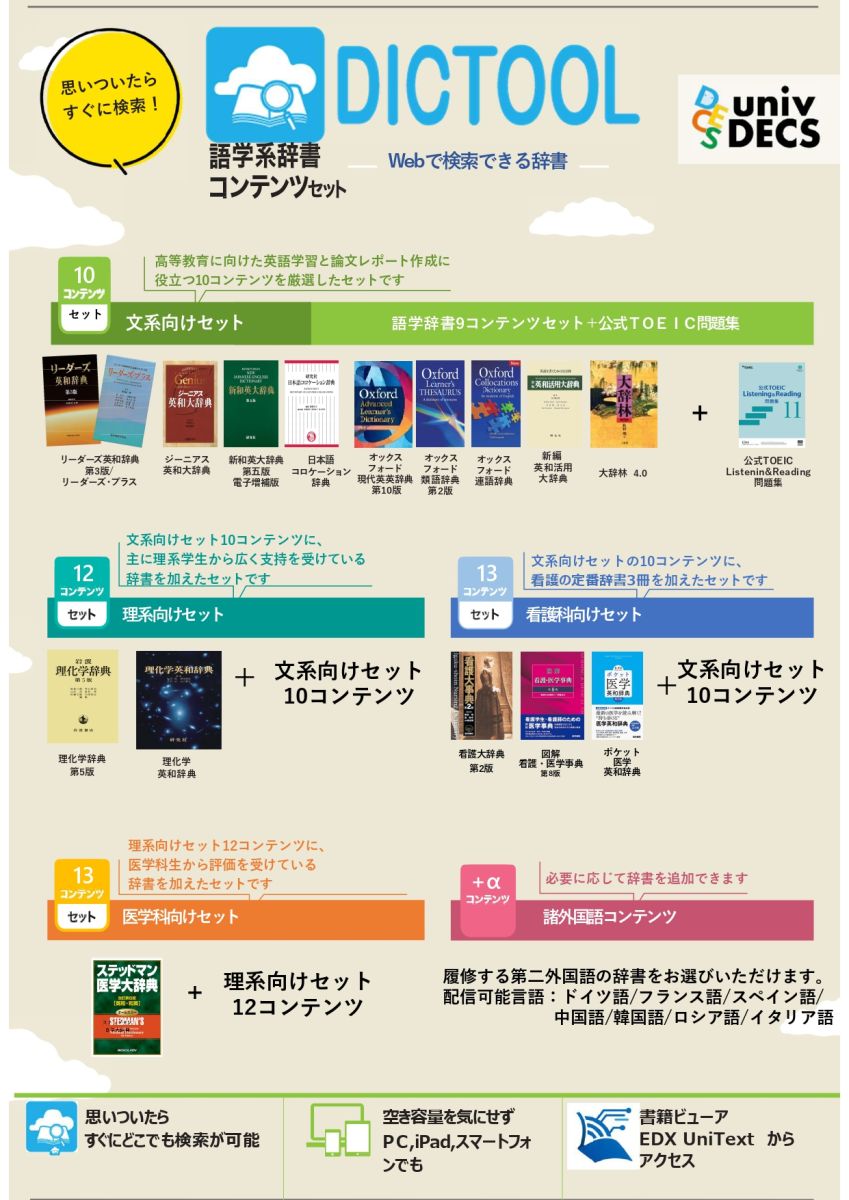 DICTOOL(ディクツール)とは大学生協の辞書コンテンツを利用するための、辞書ビューアです。 ネットワーク環境であれば、「いつでも」「どこでも」ネット上のフリー百科事典に頼らず、信頼のある辞典で語句を調べることができます。