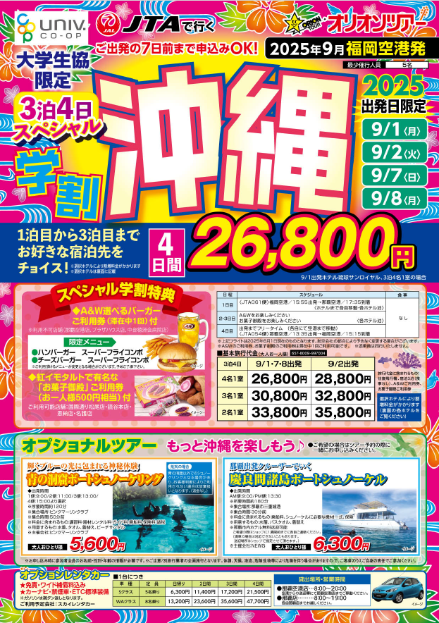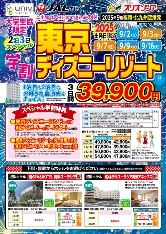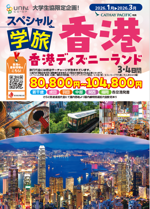 - 大学生協では、組合員のみなさまの帰省や出張、就職活動、サークルやゼミの合宿、仲間同士での旅行など、ご予算に応じたパッケージ旅行を豊富に取り扱っています。