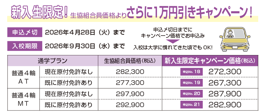 ※自動車学校で直接申し込まれるとキャンペーン・生協の割引は適用されませんのでご注意ください。