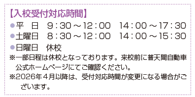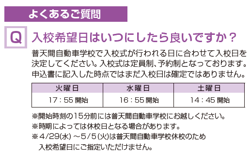 入校受付後、普天間自動車学校の指定した入校式にご参加ください。入校に関する確認事項・質問事項については、普天間自動車学校に直接お問い合わせください。