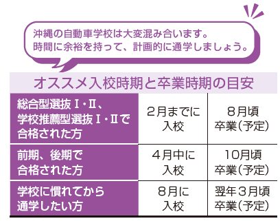 入校日の前日までに、普天間自動車学校に来校、入校受付を済ませて下さい。