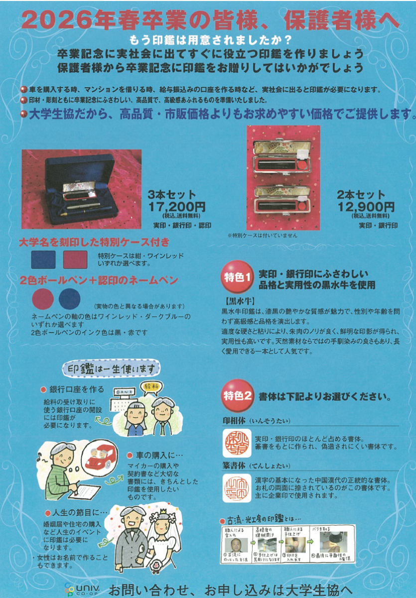 12月中旬に、2025年度卒業予定の皆様にはご実家宛てに生協よりDMをお送りします。