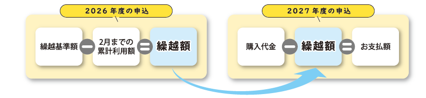 各プランで設定している繰越基準額から後期試験最終日までの利用金額を差し引いた額を、翌年度ミールカードを継続する際の購入金額に充てる事ができます。