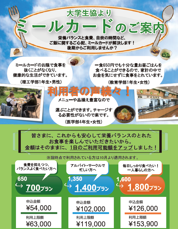 大学生協では、栄養バランスのとれたお食事を手軽に楽しめる「ミールカード」のお申込みを後期以降も受付しております。ぜひご検討ください。