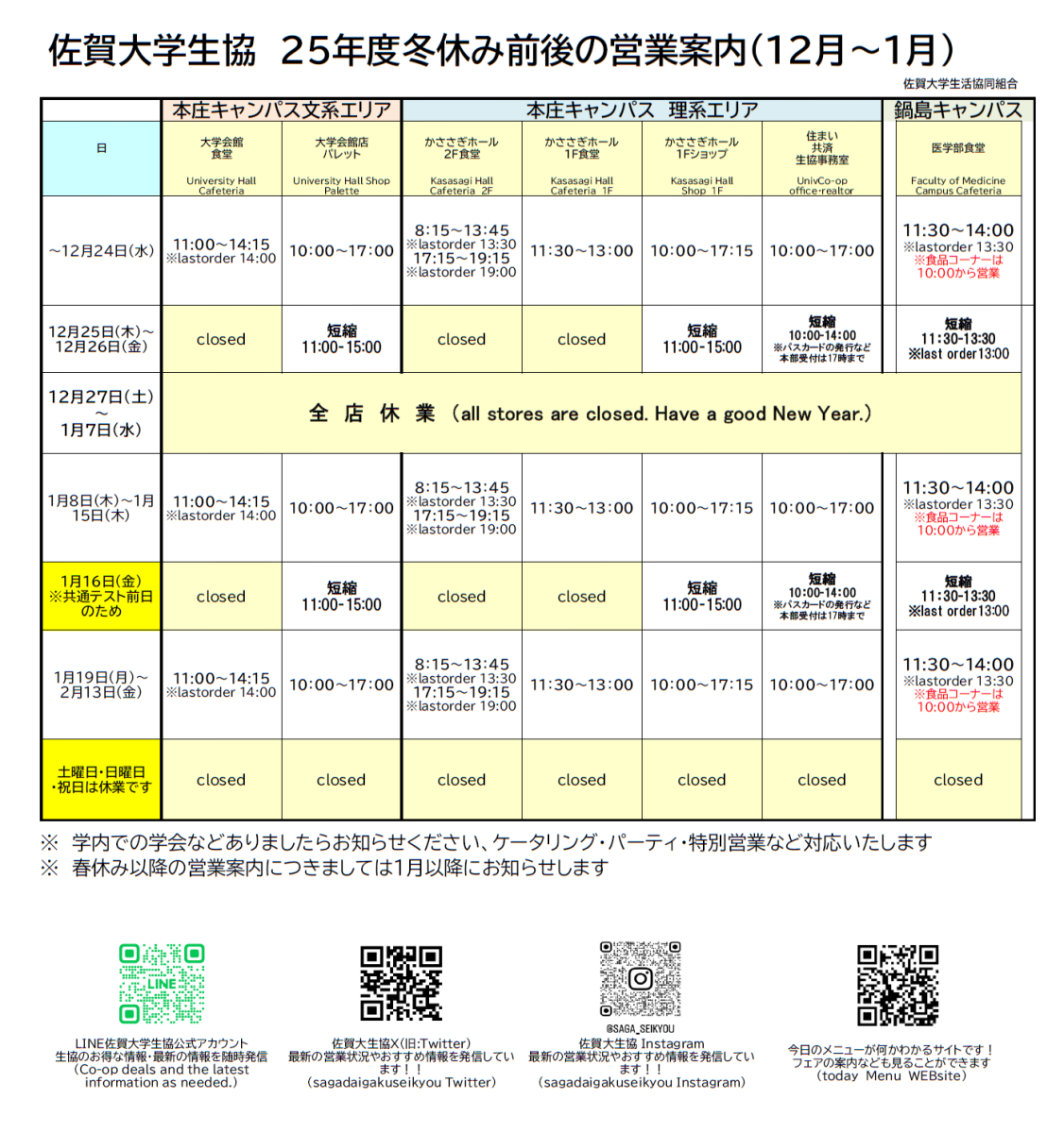 ○12月25日(木)より冬休みのため営業店舗縮小・営業時間の短縮を行います