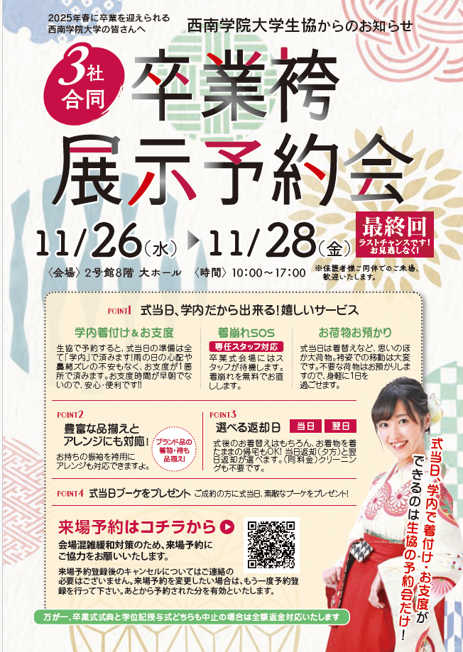 西南学院大学の卒業式で15年以上のサービス提供実績のある信頼のおける衣装会社です。