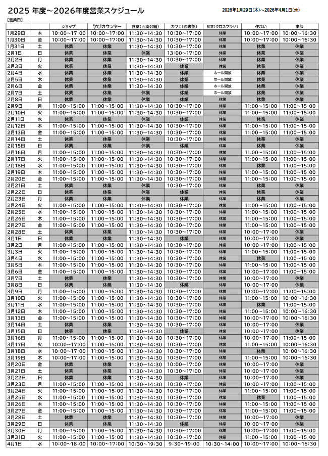 2026年1月29日~2026年4月1日の生協営業時間のご案内