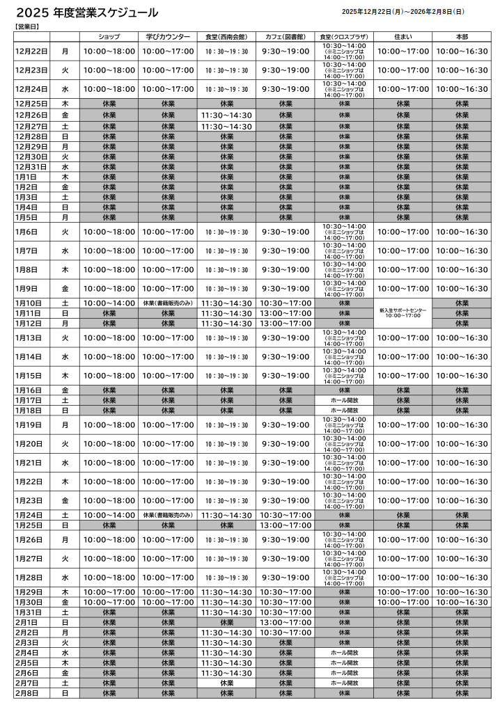 2025年12月22日~2026年2月8日の生協営業時間のご案内