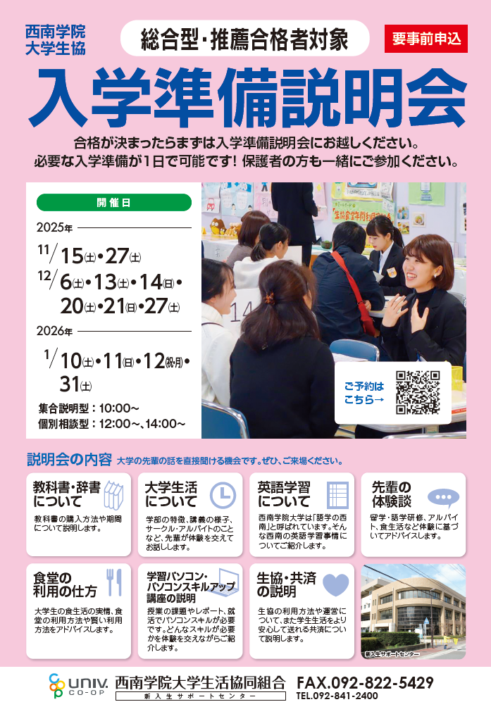 担当の先輩が1家族ごとに付きますので、より詳しい話やご自身に合わせた入学準備サポートが可能です!