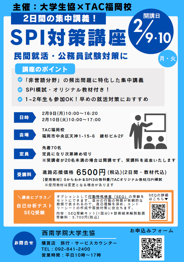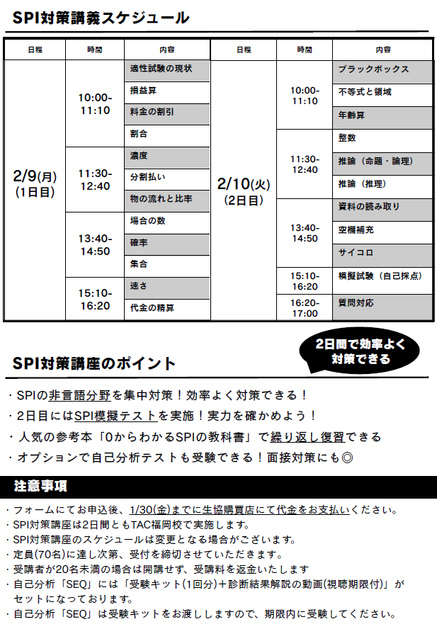 2月9・10日開催 SPI対策講座
