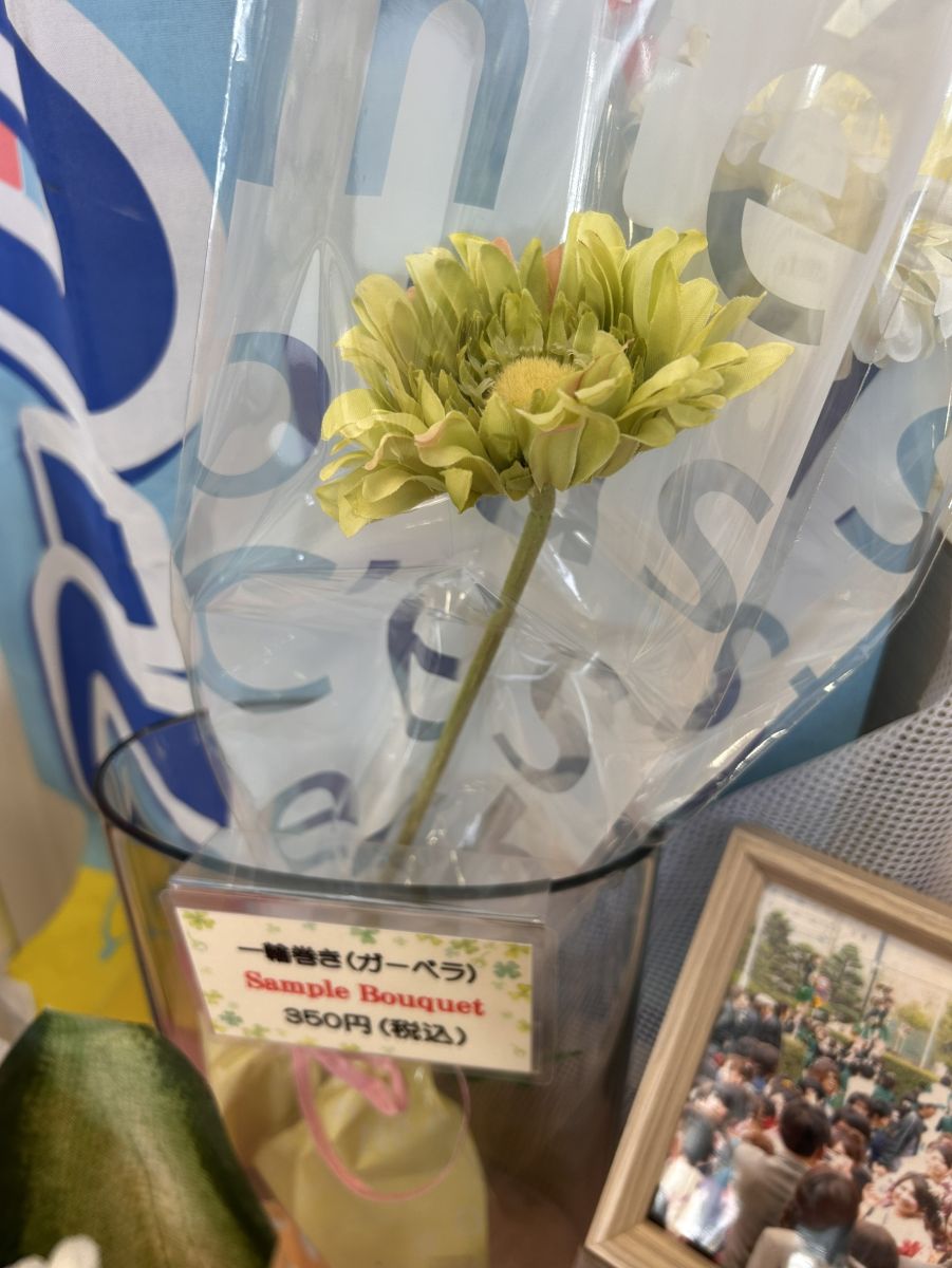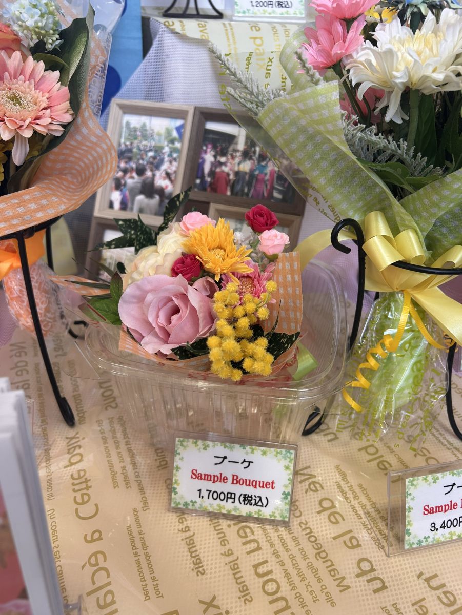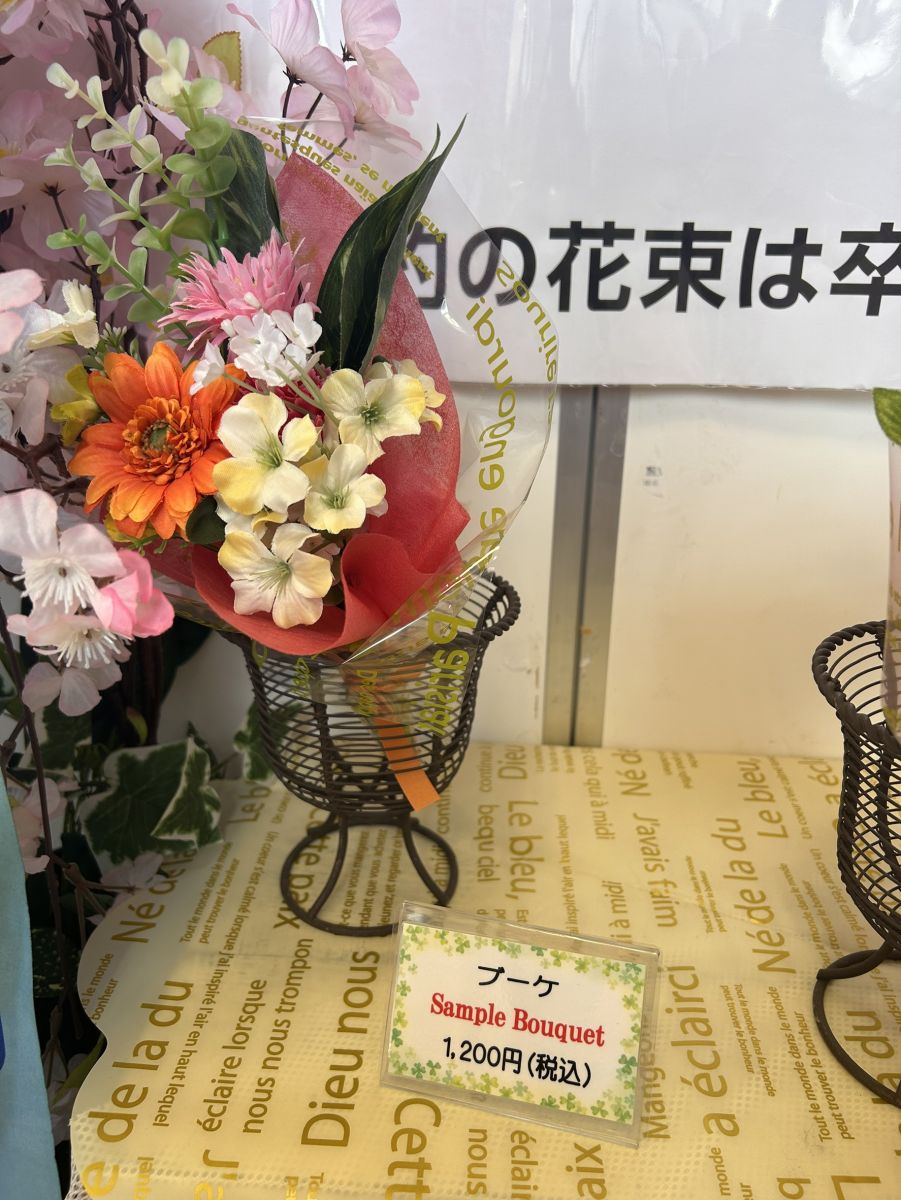 卒業花束の受付を開始しました!西南会館食堂入り口、購買店にてサンプルを展示しています。