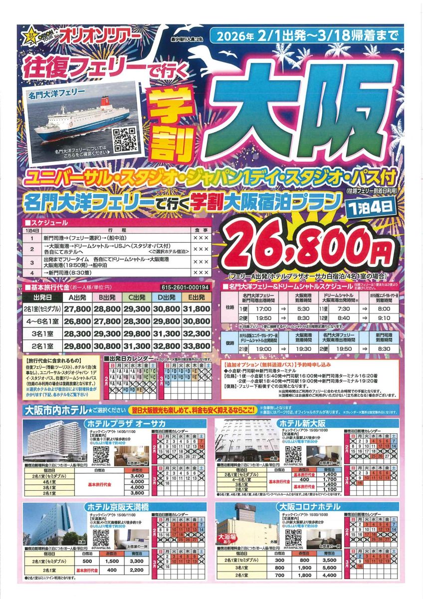 1dayパス+往復フェリー代+ホテル宿泊代(1泊)が付いてこの価格!【お得な価格】でUSJや大阪、京都の観光を楽しみたい方には大変おすすめのプランです