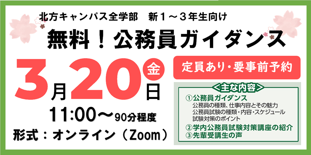 ◆【北方・主に新2-3年生】3/20(金)公務員ガイダンス開催お知らせ◆