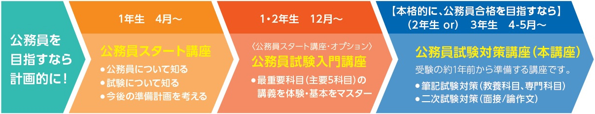 一方、近年は2-3年次から受験できる公務員本試験も一部で始まっています。(例:国家総合職教養区分、国家一般職教養区分 など)