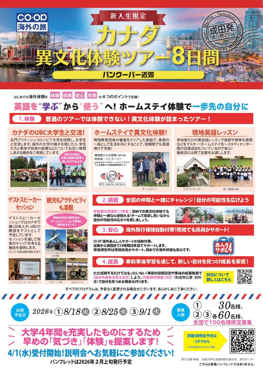 全国の新入生と一緒にカナダでチャレンジしませんか?