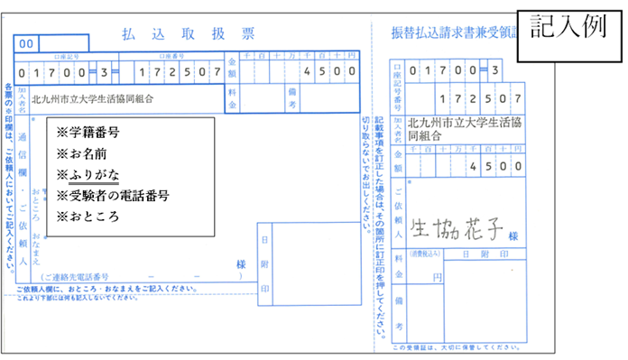 ※電信は使えません。郵便局の払込取扱票を使ってください。(本館地下1階 生協ショップ前にも用意しています)
